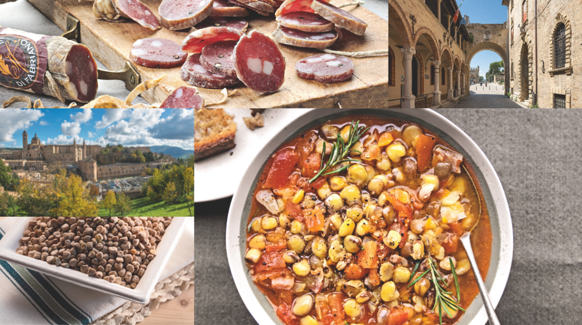 Da sinistra, il salame di Fabriano, eccellenza della norcineria marchigiana e presidio Slow Food; l’Arco di Augusto, antico ingresso di Fano, cittadina sulla costa. In basso, una veduta di Urbino, gioiello architettonico perfettamente conservato e sotto le cicerchie di Serra de’ Conti, un’antica varietà, oggi presidio Slow Food, coltivata sulle colline dell’entroterra