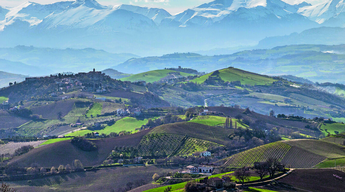 In copertina le colline dell’entroterra di Ascoli Piceno, con il borgo medievale di Montefiore dell’Aso e il profilo dei monti Sibillini (Archivio fotografico Regione Marche – Andrea Tessadori)