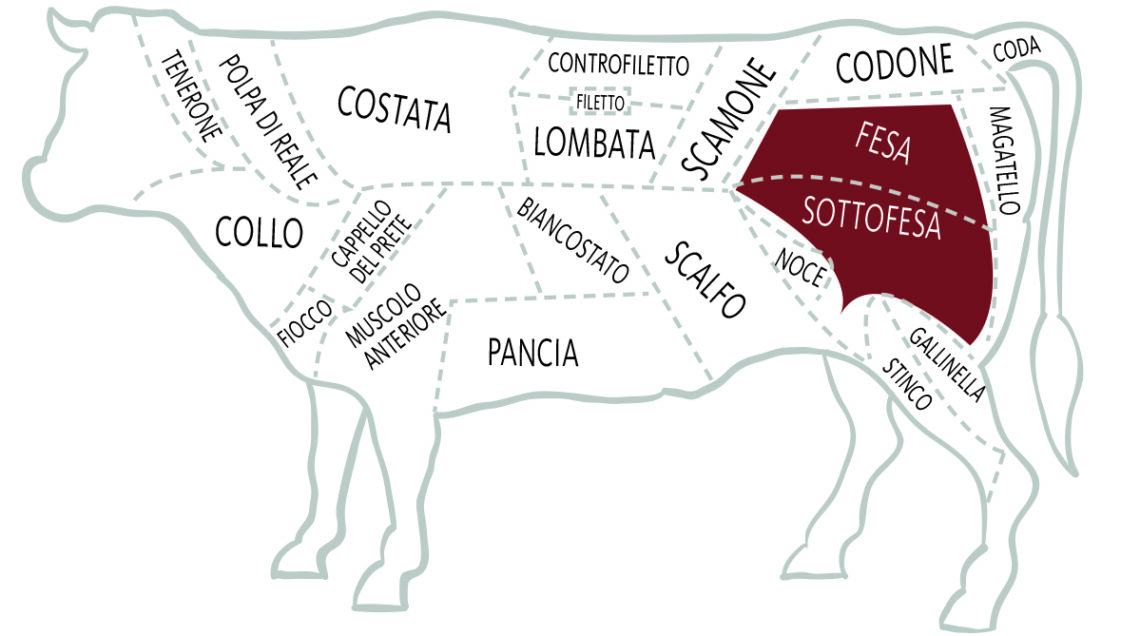Il nome è simile, ma si tratta di due tagli differenti, catalogati di prima categoria e ricavati dal quarto posteriore del bovino. Nella parte alta della coscia si trova la fesa, di grandi dimensioni, formata da fibre muscolari sottili e per questo molto tenera. Dal retro della coscia si ricava invece la sottofesa, anche questa tra i tagli più grandi dell’animale.