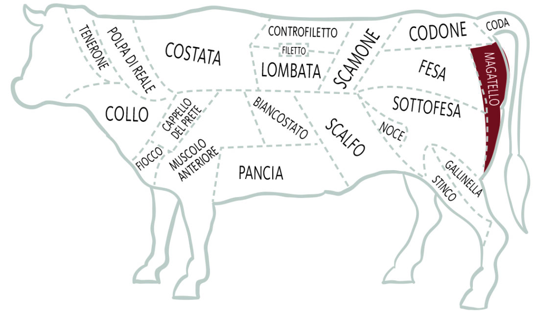 È un taglio che prende molti nomi: oltre a magatello, diffuso soprattutto in Lombardia, il più comune è girello, tondino o tondello, mentre al Sud è detto lacerto. Si tratta di una delle parti più pregiate del quarto posteriore di bovino, apprezzate per la loro magrezza. Viene ricavato dalla parte esterna e più alta della coscia ed è costituito da un unico muscolo, dall’inconfondibile forma allungata e tondeggiante: compatto, senza nervature e con poche o nessuna infiltrazione di grasso.