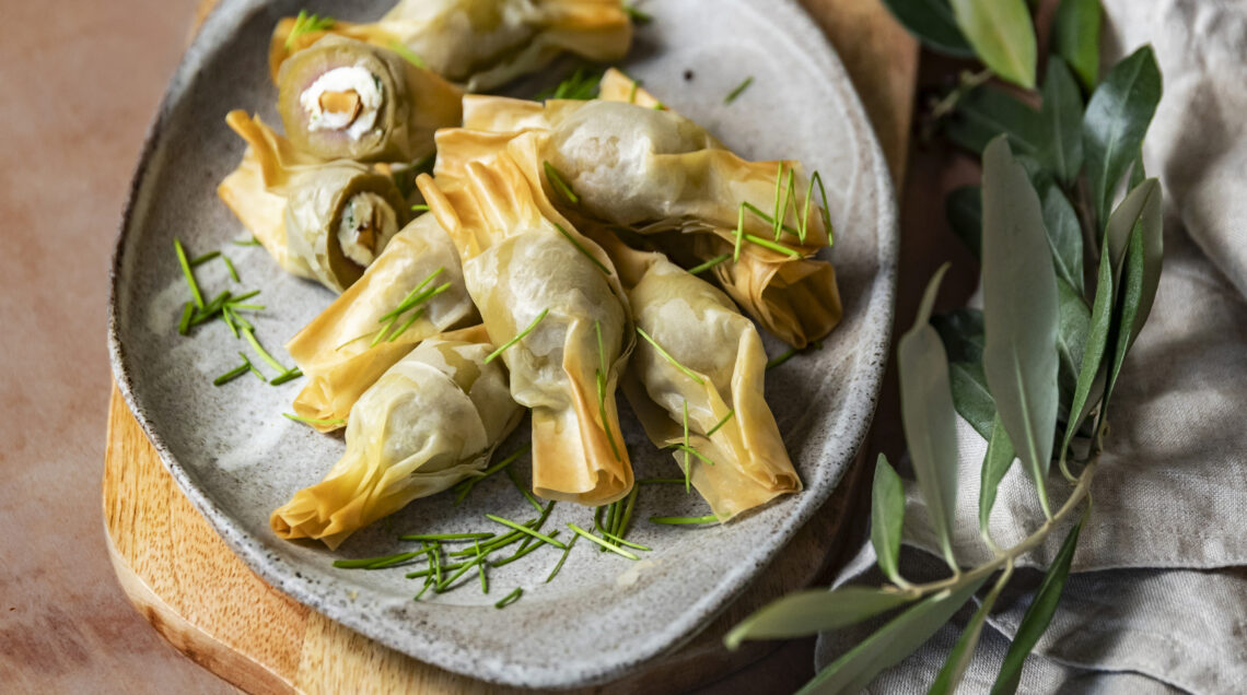 16 olive verdi Halkidiki denocciolate Fattoria dei Sapori – 4 fogli di pasta fillo – 50 g di quartirolo – 10 g di erba cipollina – 8 mandorle tostate – olio extravergine d'oliva – sale – pepe nero