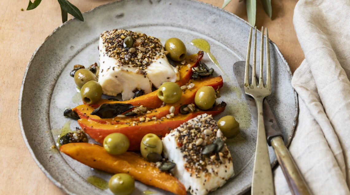 600 g di filetti di merluzzo – 600 g di zucca Hokkaido – 100 g di olive Hojiblanca verdi denocciolate Fattoria dei Sapori – 1 spicchio d'aglio – 2 rametti di rosmarino – 4 foglie di salvia – 2 rametti di timo – 1 dl di vino bianco secco – 15 g di semi misti, tostati – olio extravergine d'oliva – peperoncino piccante in polvere – sale