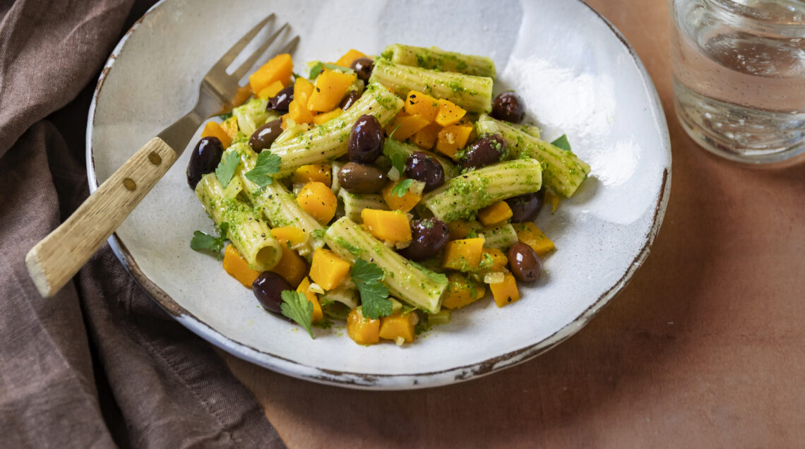 320 g di tortiglioni – 200 g di patate americane dolci – 2 scalogni – 1 cuore di sedano verde con le foglie – 80 g di olive Taggiasche denocciolate Fattoria dei Sapori – 1 limone non trattato – 2-3 rametti di prezzemolo – olio extravergine d'oliva – pepe nero – sale