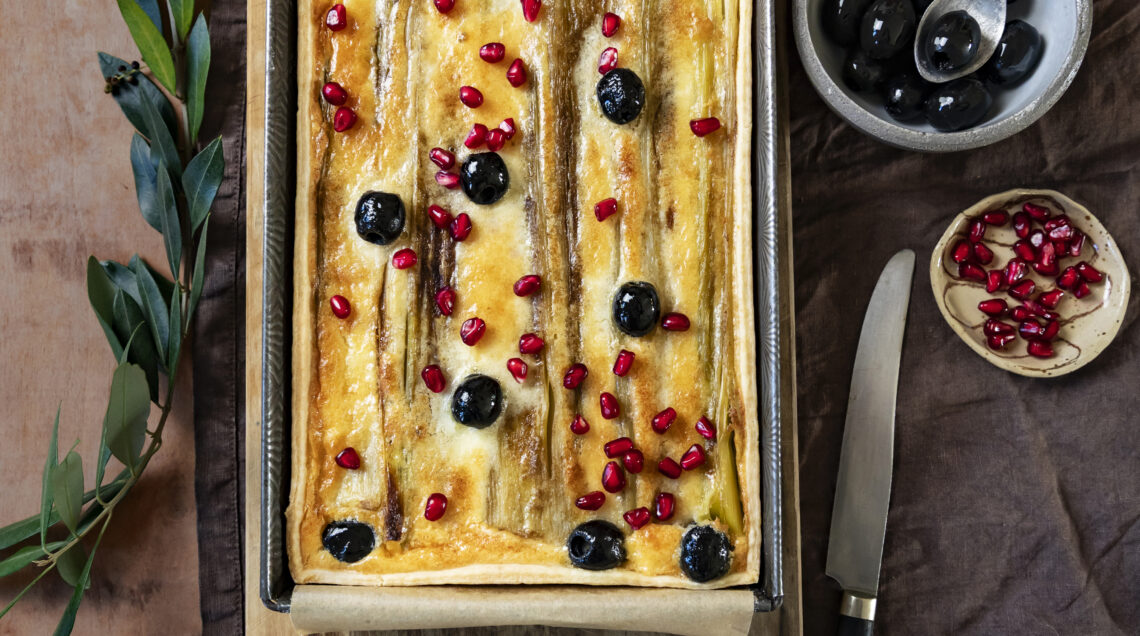 4) Sbattete le uova rimaste con la panna, un pizzico di sale, una macinata di pepe e il parmigiano reggiano. Versate il composto nel guscio di pasta, unite i porri alternandoli alle olive e cuocete in forno già caldo a 160° per 45 minuti. Fate intiepidire la tarte e servitela cosparsa con i chicchi di melagrana.