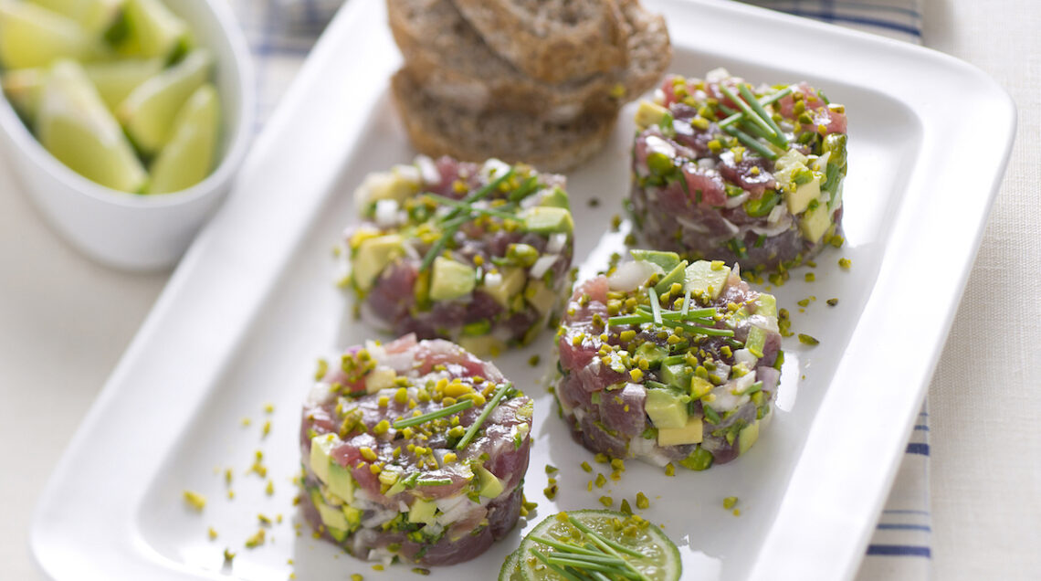 Cominciamo con le mini tartare di tonno e avocado, ricetta che unisce due tra gli abbinamenti più azzeccati per i pistacchi, deliziosi con la freschezza del pesce crudo e croccanti sulla cremosità del frutto esotico. Sbucciate 4 patate, tagliatele a dadini e cuocetele 10 minuti a vapore. Spellate e tritate mezza cipolla rossa di Tropea. Tagliate a dadini piccoli 300 g di tonno fresco, trattato per il consumo a crudo (abbattuto) e conditeli in una ciotola con un filo d’olio, un pizzico di sale, qualche goccia di Tabasco, erba cipollina tagliuzzata e il succo di mezzo lime. Sbucciate e snocciolate un avocado, riducetelo a cubetti e condite anch’esso con il succo di mezzo lime, sale e Tabasco. Mescolatelo al tonno e unite le patate, la cipolla e 2-3 cucchiai di pistacchi americani, sgusciati e tritati in modo grossolano. Mescolate e componete le tartare nei piatti aiutandovi con un anello coppapasta, compattandole con il dorso di un cucchiaino. Decorate con una manciatina di pistacchi tritati, steli di erba cipollina e fettine di lime.