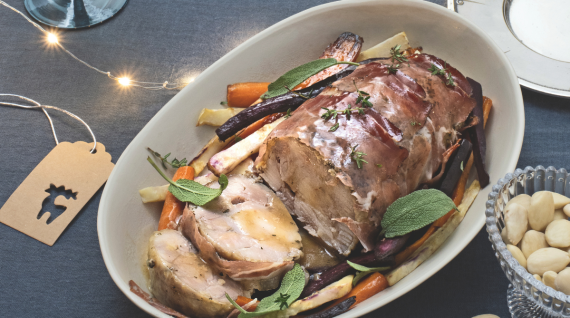 Morbido e succoso: arrosto di pollo in crosta di speck, salvia e mandorle