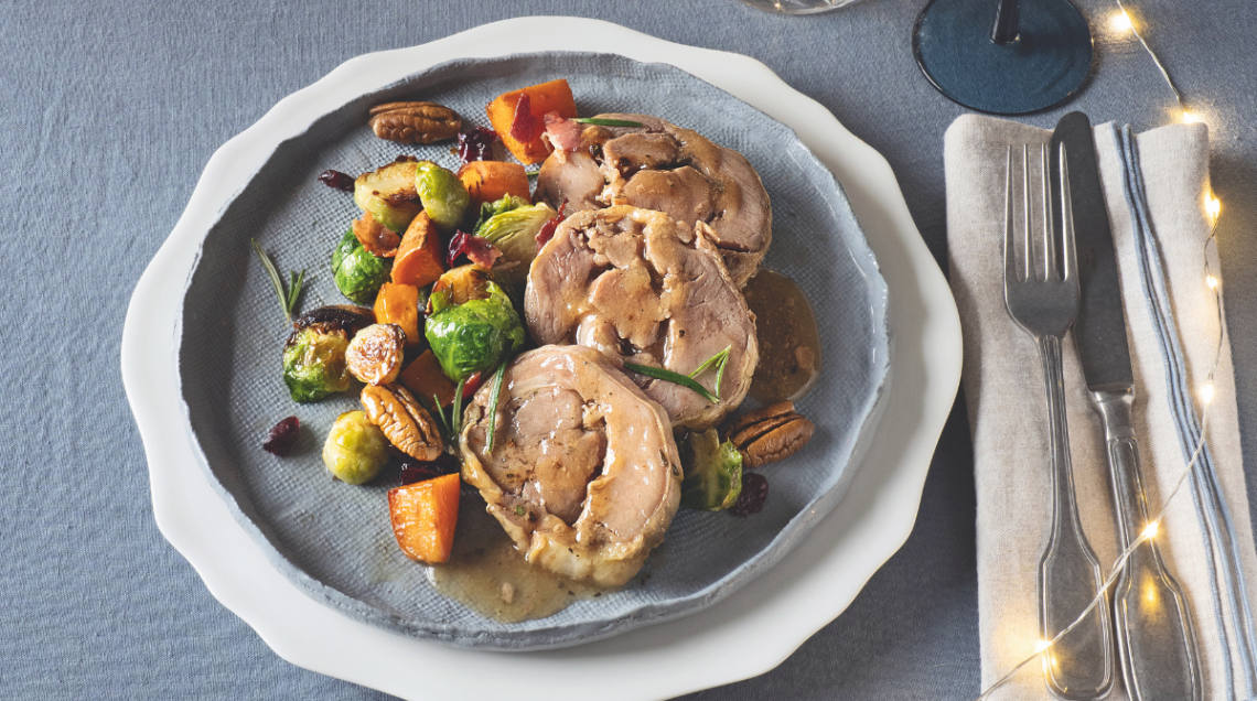 1 arrosto classico con tacchino, pollo e suino Fileni – 500 g di cavolini di Bruxelles – 500 g di zucca Butternut – 3 cucchiai di miele – 45 g di cranberry secchi – 40 g di noci pecan – 4 fette di bacon – 2 rametti di rosmarino – 200 ml di vino bianco – 30 g di burro – olio extravergine d'oliva – sale – pepe