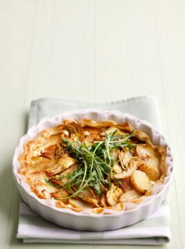 Ispirata a una delle più famose torte salate francesi, ecco la ricetta di una gustosa quiche vegetariana, con carciofi, patatine novelle e feta