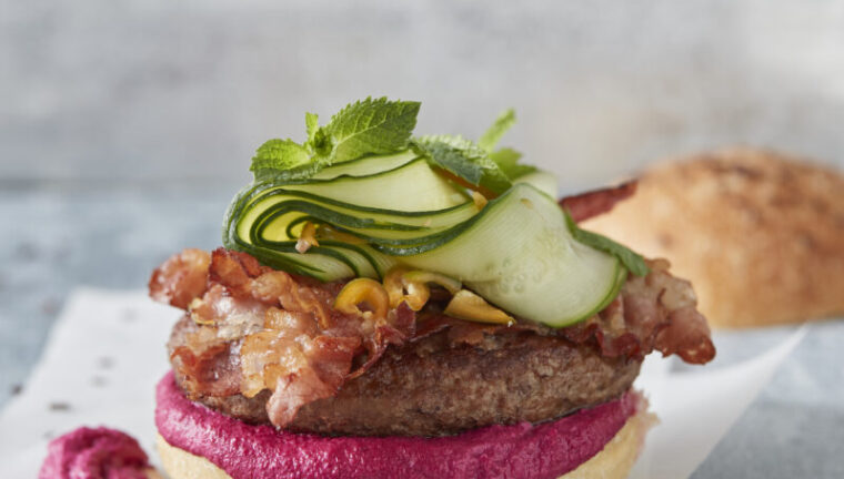 Burger con maionese alla barbabietola, cetriolo marinato e bacon croccante
