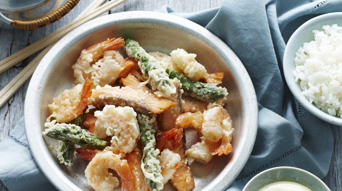 2) Lavate tutte le verdure e tagliatele a julienne spesse. Lavate i gamberi lasciando la coda all’estremità. Eliminate il fi letto nero con uno stuzzicadenti e asciugate bene. Scaldate l’olio nella pentola, prendete la pastella dal frigo, immergete le verdure e i gamberi e fateli friggere nell’olio bollente. Fateli dorare da entrambi i lati e scolateli su carta assorbente.
