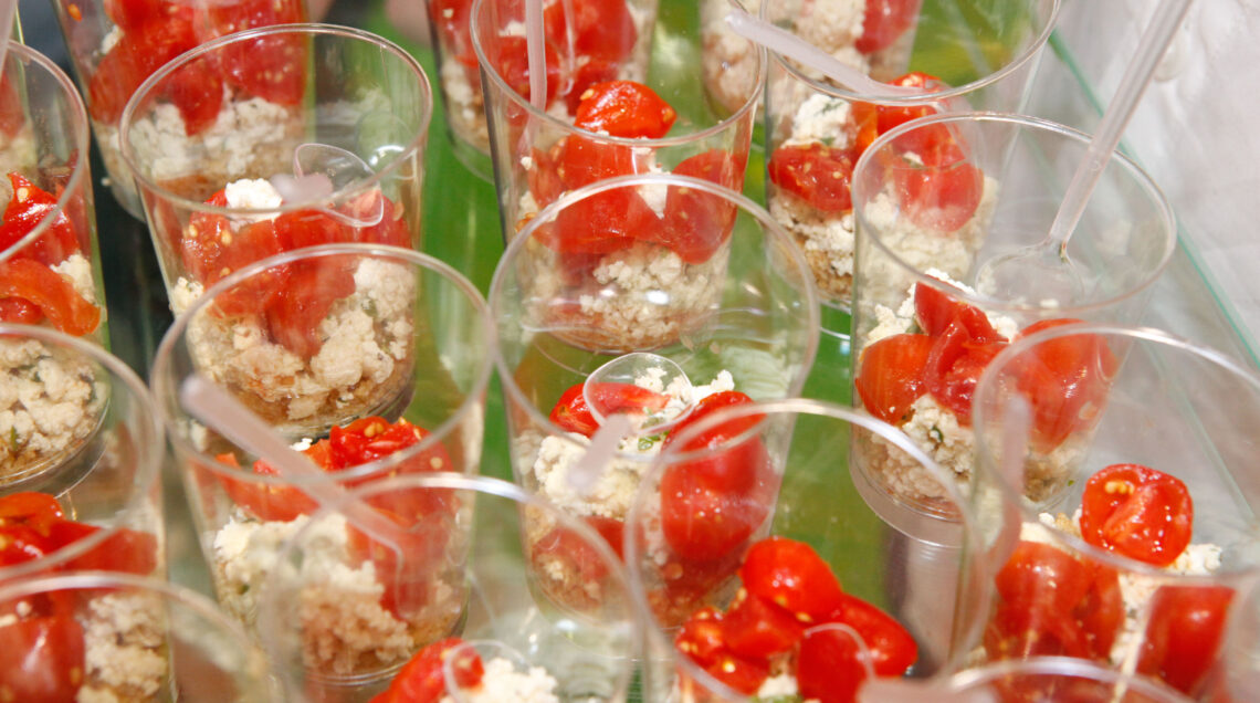 Durante il primo showcooking, sono state presentate le ricette delle ‘Polpettine su stecco con salsa speziata al curry’, un’idea carina e divertente da proporre agli amici per un party sul terrazzo. Le polpette sono state realizzate con il macinato vegetale, che è un prodotto ad alto contenuto proteico composto da soia senza OGM e tofu ed è molto versatile, perchè si presta per cucinare ragù, polpette o hamburger vegetariani e saporiti, declinabili con spezie e verdure di ogni tipo. Poi è stata la volta del ‘Crumble alle erbe fresche con pomodorini marinati’, una base di briciole di grissini aromatizzati alle erbe mediterranee con fior di tofu marinato all’olio e pomodorini. Anche questa perfetta per un finger food da servire in piccoli bicchierini di vetro trasparenti.