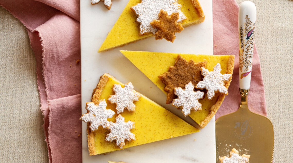 3) Stendete la pasta sul piano leggermente infarinato a uno spessore di 4-5 mm e trasferitela in uno stampo per crostate da 26 cm di diametro; rifilate la pasta in eccesso (servirà per le decorazioni), bucherellate il fondo con una forchetta e trasferite lo stampo in frigo per 30 minuti. Intanto ritagliate dei fiocchi di neve dalla pasta avanzata e sistemateli su una placca foderata con carta da forno. spennellateli con il tuorlo sbattuto con poche gocce di acqua o latte.