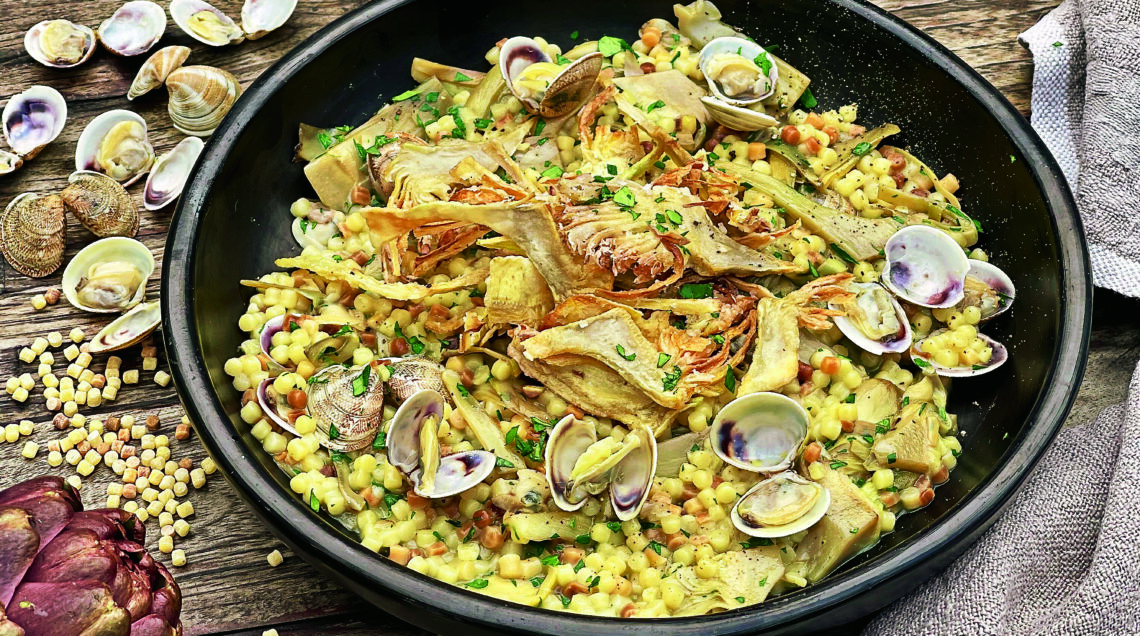 1 Pulite i carciofi; tagliatene 2 in 8 pezzi e gli altri 2 in fette molto sottili. Trasferiteli in due ciotole con acqua e limone. In una padella fate aprire le vongole lupini certificate MSC con 1 spicchio d'aglio e qualche rametto di prezzemolo, aggiungendo 1 bicchiere di acqua per ottenere più liquido di cottura per poi cuocere la fregola.