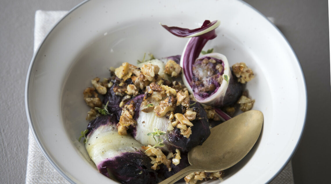3 Disponete le foglie di radicchio sul piano di lavoro, mettete 1 cucchiaio di lenticchie all'estremità di ognuna, aggiungete 1 bastoncino di toma e arrotolate le foglie su se stesse. Sistemate gli involtini sulla placca, spennellateli con il miele rimasto e infornate a 180° per 5 minuti. Serviteli con il crumble di noci e foglioline di timo.