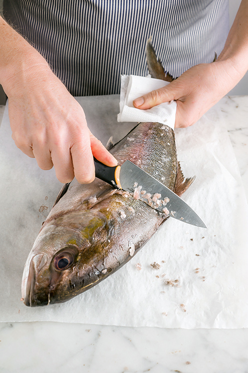 1) Squamate 1 ricciola di 1,2 kg con la parte non tagliente di un coltello; sciacquatela e praticate 3-4 tagli paralleli sui fianchi. Inserite nella pancia 2-3 scalogni spellati e tagliati a spicchi e 2-3 rametti di maggiorana; salate e pepate il pesce dentro e fiori.