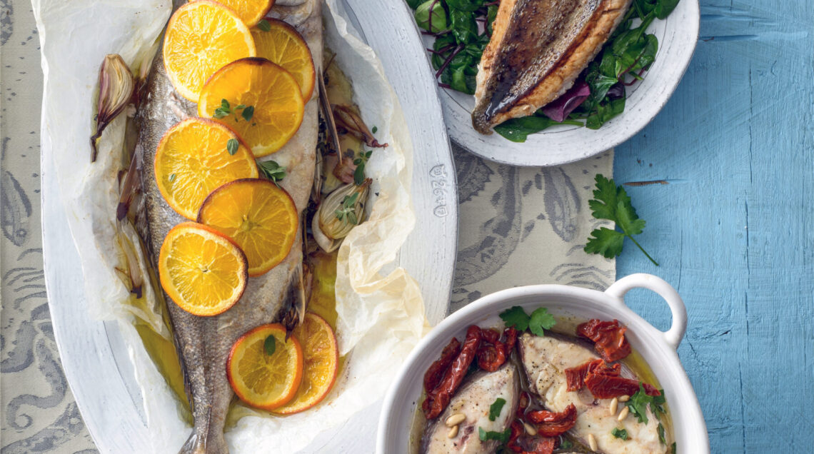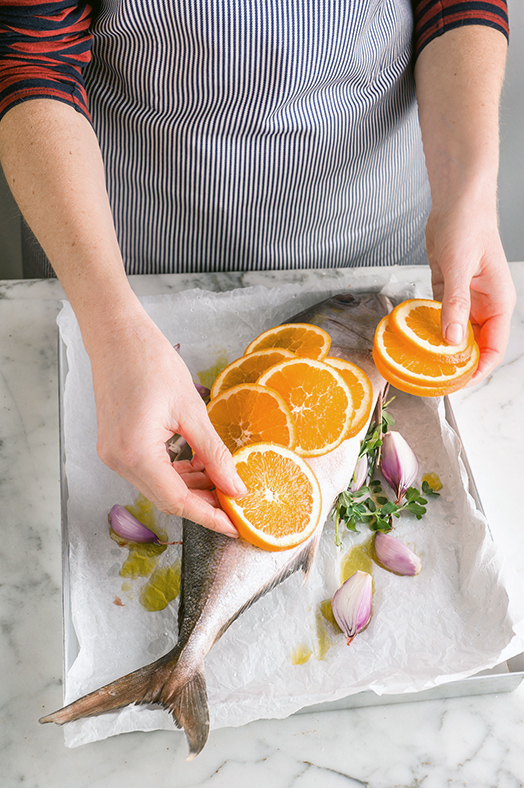 2) Lavate 2 arance non trattate e tagliatele a fette di 1/2 cm. Disponete la ricciola sulla placca foderata con carta da forno bagnata, strizzata e unta con olio; spennellate la superficie con altro olio, copritela con le fette di arancia e disponete intorno altri 3-4 scalogni. Cuocete in forno già caldo a 180° per circa 40 minuti.