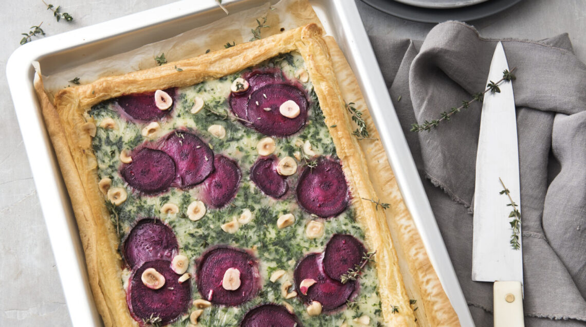 Un jolly in cucina, la torta salata rimane un asso nella manica per chi ha poco tempo, avanzi da riciclare, ospiti improvvisi, pausa pranzo veloce. In questa ricetta abbiamo usato la pasta sfoglia, ma per questo rustico ripieno di gorgonzola, spinaci e barbabietola, potete usare anche pasta brisée, pasta da pane o pasta matta. Irresistibile la croccantezza delle nocciole.