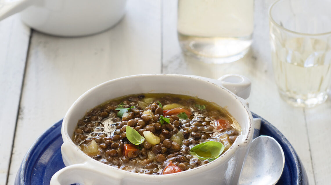 Un comfort food semplice ma gustoso, da assaporare cucchiaio dopo cucchiaio, caldissimo o appena tiepido. Le lenticchie cotte in pentola diventano ancora più gustose se cucinate in una casseruola di terracotta, magari con un soffritto di sedano, carote e cipolle tritati finemente. Il lettore non vegano potrà aggiungere qualche dadini di lardo o di pancetta. Patate e pomodorini innalzano il gusto e il trito di aglio e peperoncino porta una ventata piccantina alla zuppa.