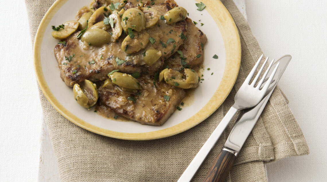 1) Con un coltellino, denocciola le olive, poi tagliale a pezzi grossi. Infarina leggermente la carne, poi scuoti l’eccesso. Trita finemente la cipolla sbucciata.