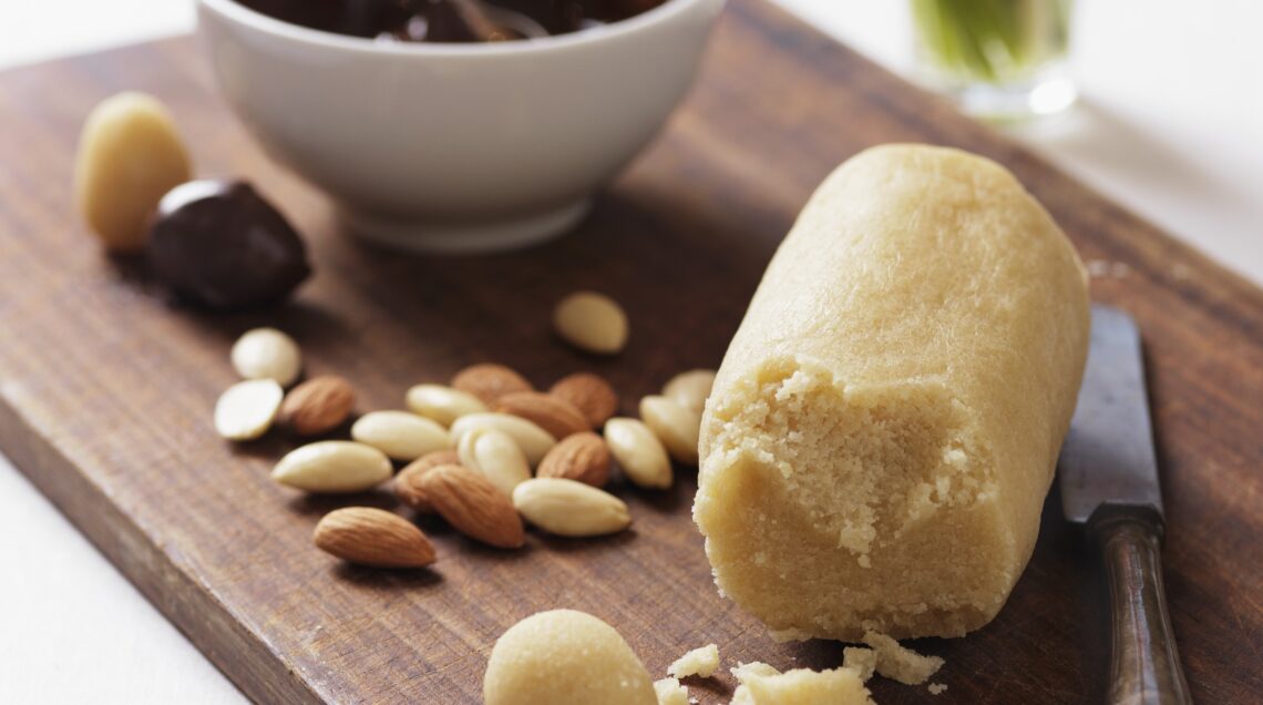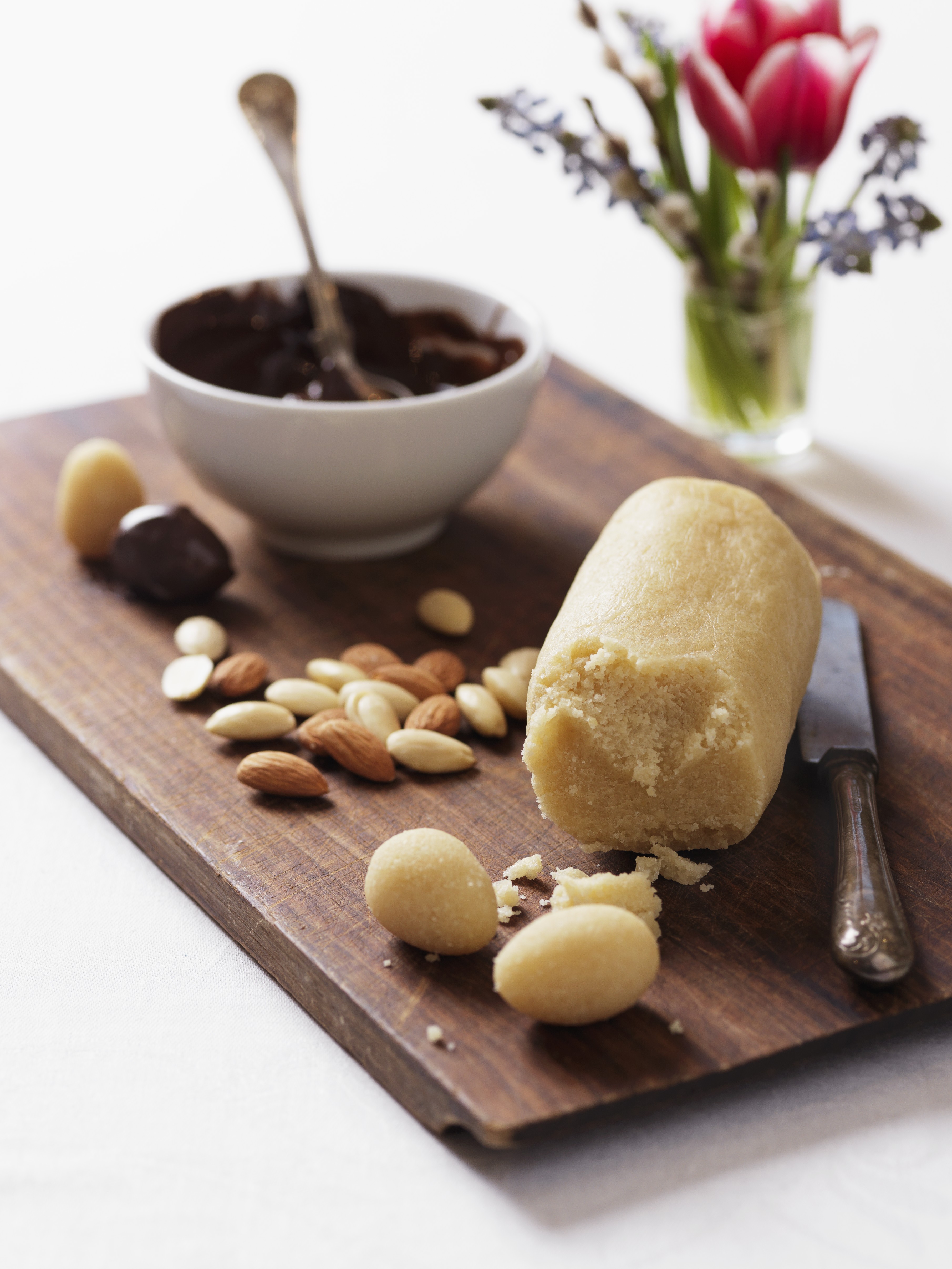mandorle polverizzate nel mortaio o nel mixer con aggiunta di zucchero e successivamente mescolate con sciroppo di zucchero e glucosio. Richiede una lavorazione piuttosto lunga, ma se ne può preparare una certa quantità conservabile in barattoli ben chiusi e al fresco (ma non in frigo).