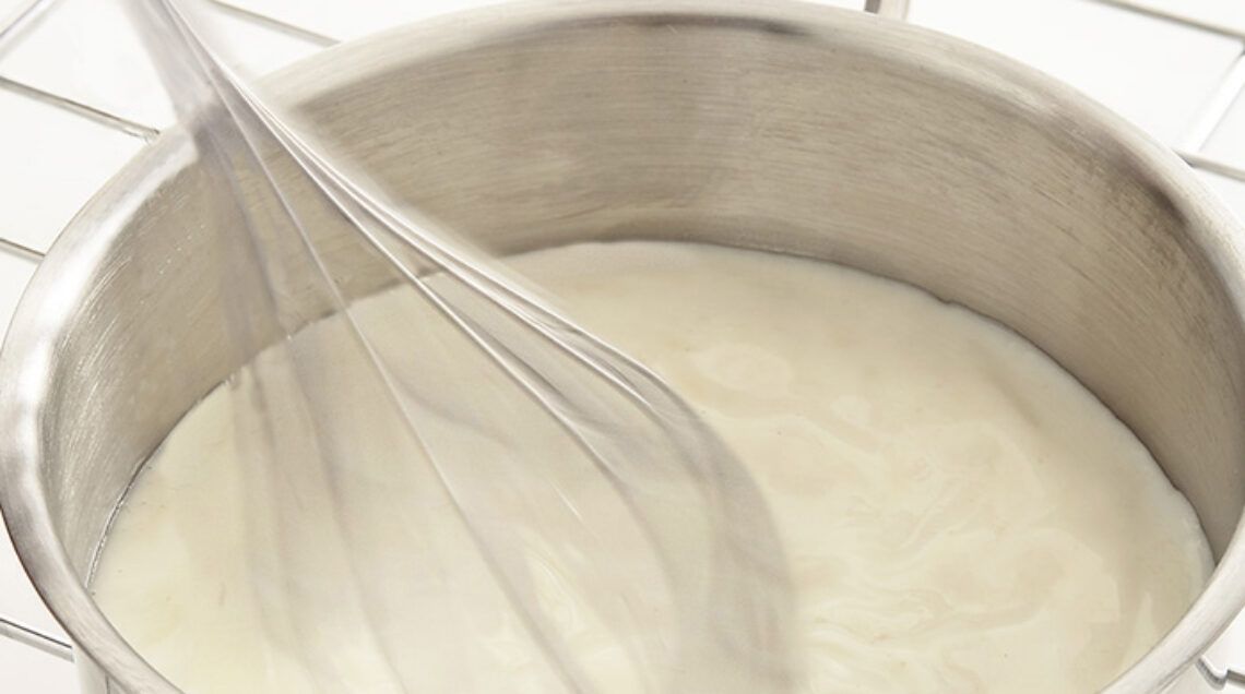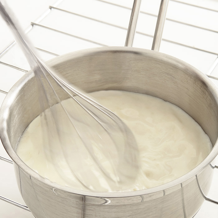 3 A mano a mano che il latte verrà aggiunto, l’impasto di burro e farina tenderà a diventare dapprima granuloso, poi a addensarsi rapidamente. Quindi, piano piano, diventerà sempre più fluido, liscio e dorato. È importante che il latte venga versato a piccole dosi. Si cuoce la