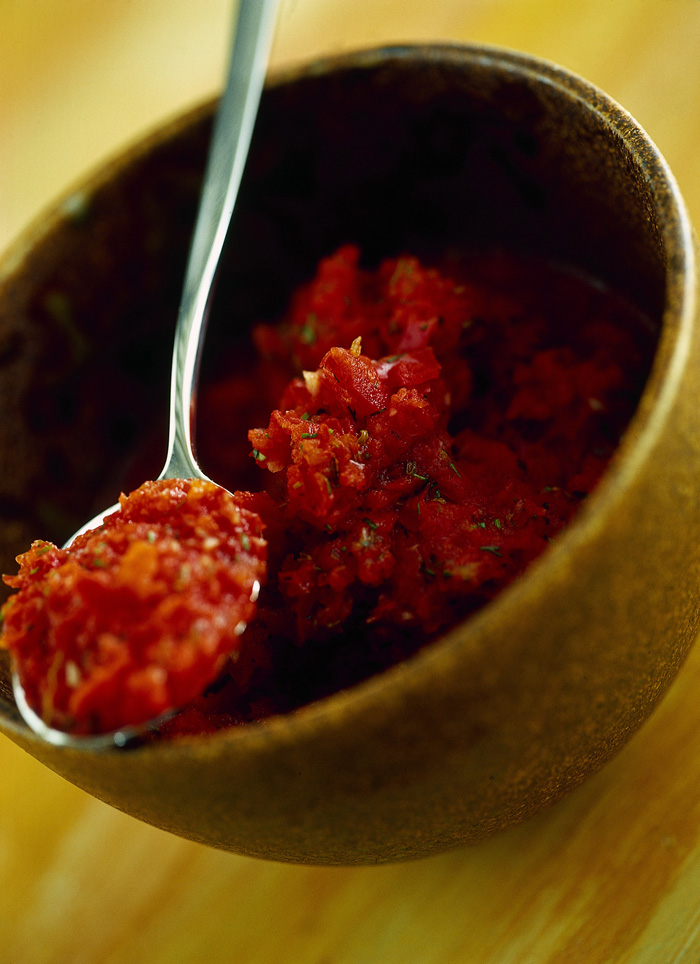salsa piccante a base di peperone rosso, peperoncino, aglio, cumino e menta: è la salsa piccante per eccellenza della cucina maghrebina.