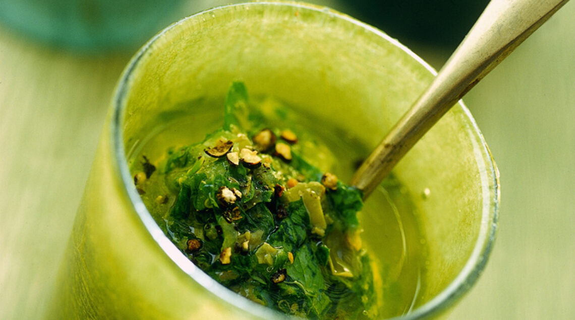 fredda, a base di olio, aceto, sale, pepe e un trito di erbe aromatiche. Il tutto va ben emulsionato e serve per condire insalate o carni fredde.