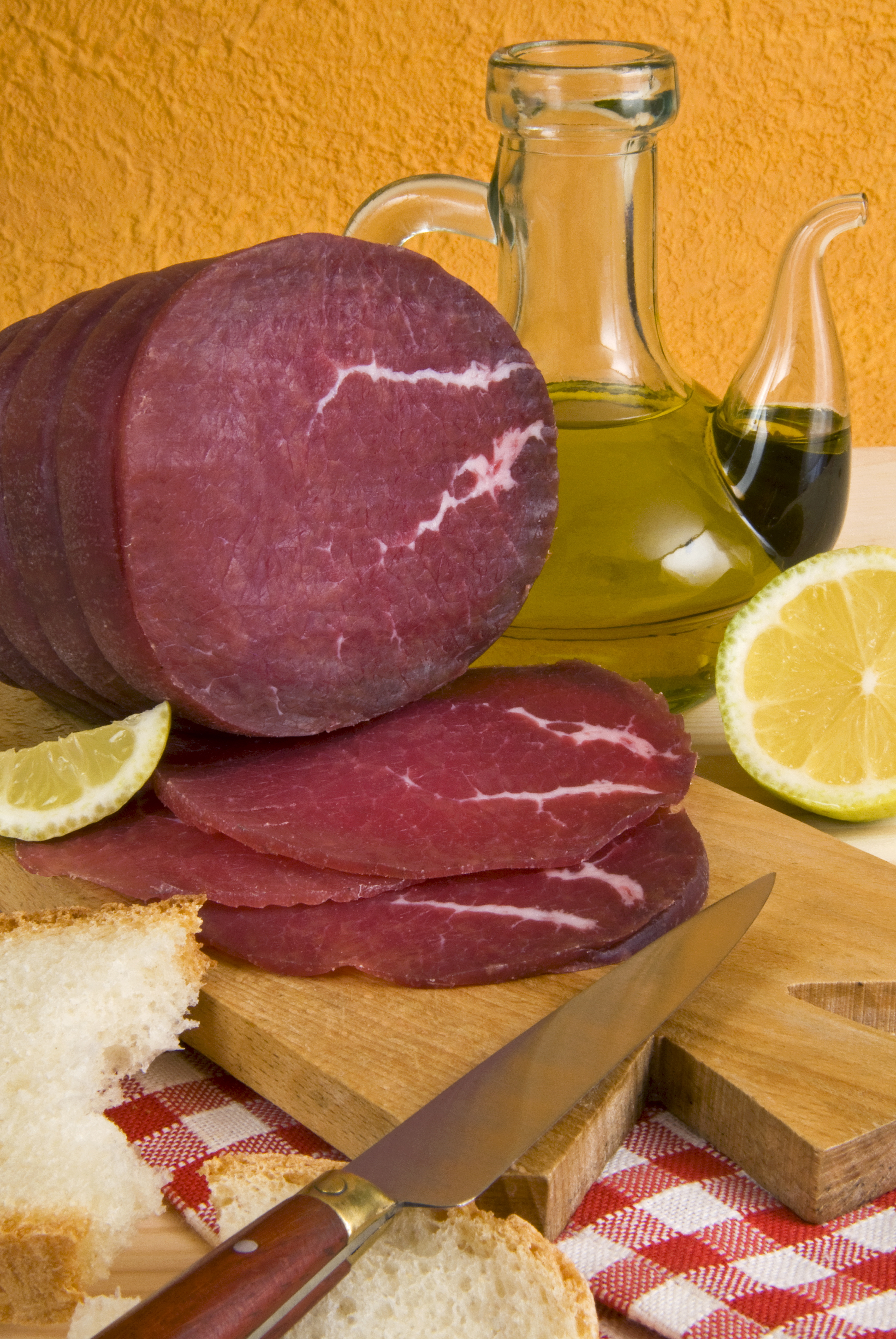 carne di manzo (noce, filetto, fesa) salata, marinata con aromi diversi e stagionata. La si gusta affettata sottilmente e condita con olio, limone e pepe. Il suo sapore è più intenso di quello del prosciutto e, poiché si tratta di un prodotto magro, è particolarmente indicata nelle diete.