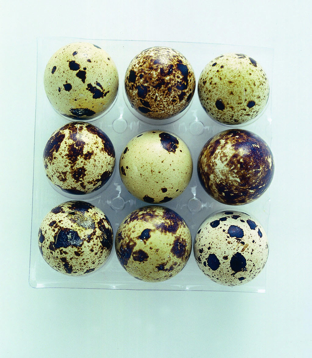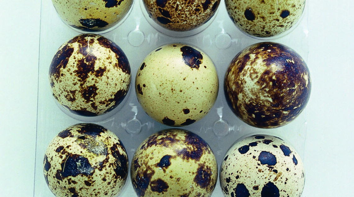 uova di quaglia hanno il guscio picchiettato di scuro; vengono prodotte tutto l’anno (in media 200-300 uova a quaglia) e vendute in vaschette.