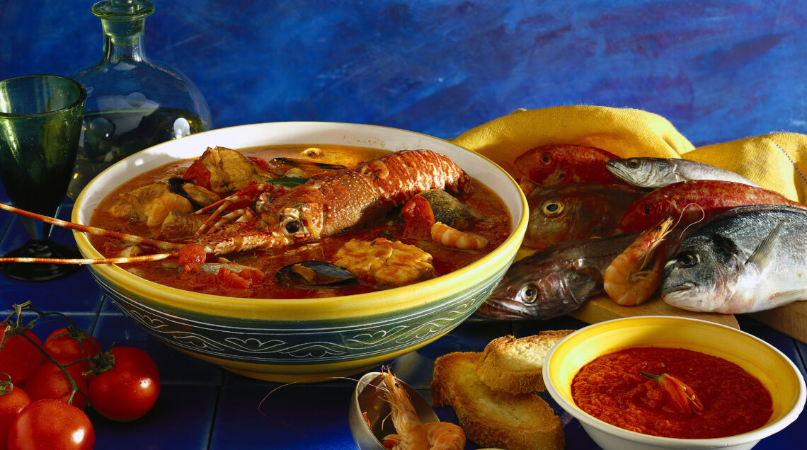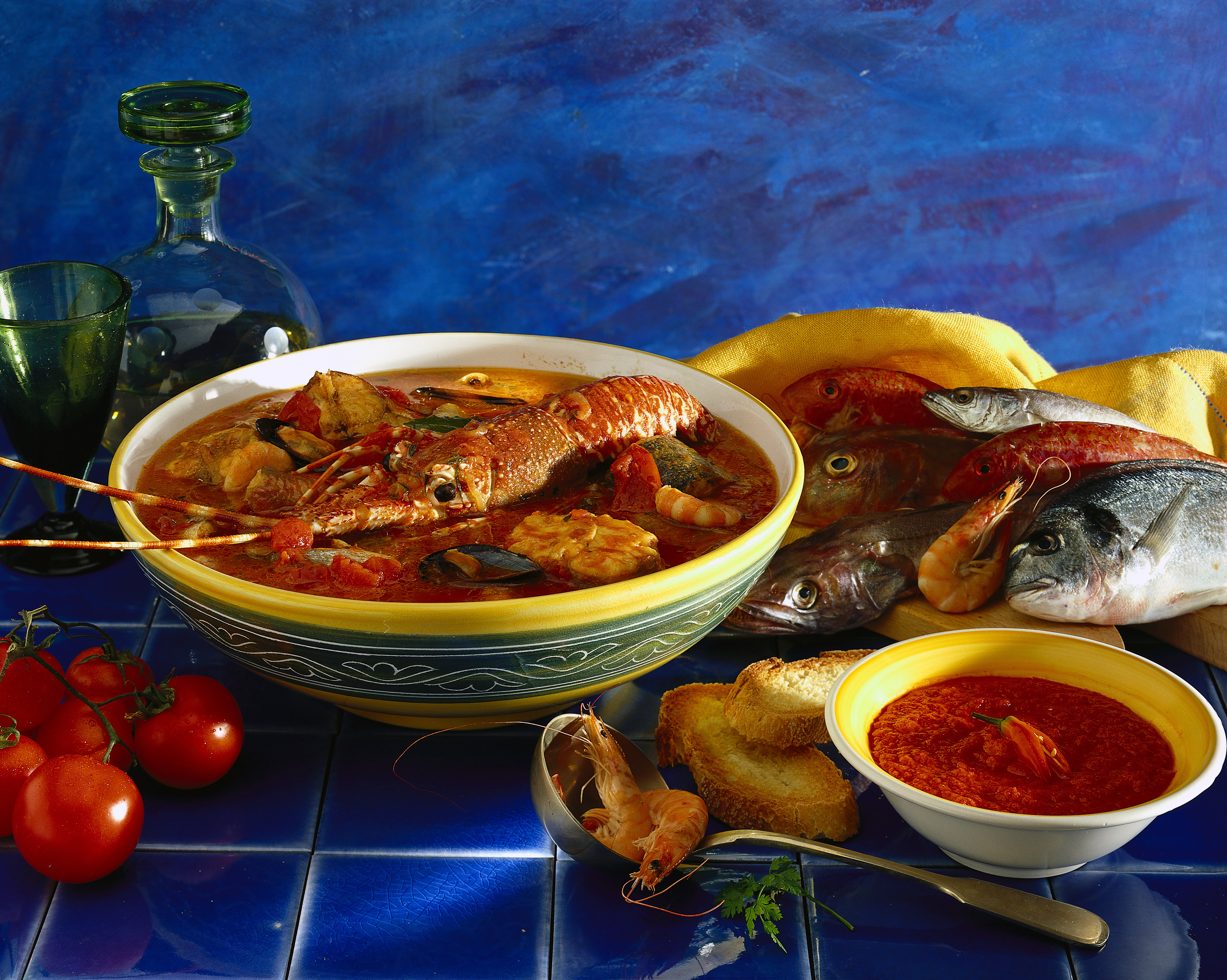varietà di pesci e di piccoli crostacei siano molte;sono di rigore anche lo zafferano, il finocchio selvatico e la scorza di arancia seccata come aromatizzanti. Pesci e crostacei vengono serviti con il brodo di cottura a parte e accompagnati con crostini di pane secco (non tostato né fritto) strofinati con l’aglio e salsa «rouille» a base di zafferano, peperoncino, aglio, mollica di pane e olio.