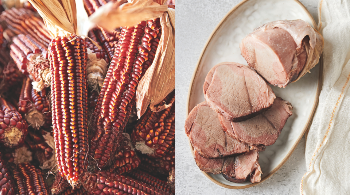 Il Rostrato rosso di Rovetta, un mais con cui si prepara una polenta di colore acceso. A destra, la spalla di Schilpario, un salume da cuocere, tipico dell’omonima valle.