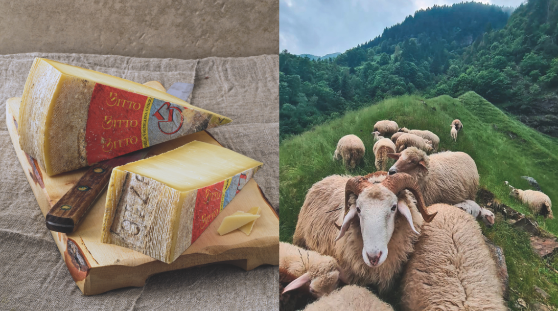 Il Bitto DOP, tipico formaggio Valtellinese che prende il nome da un torrente della valle. A destra, la pecora Ciuta, razza originaria della Val Masino. Credit: Alamy/Ipa,Carlo Mazzoleni.