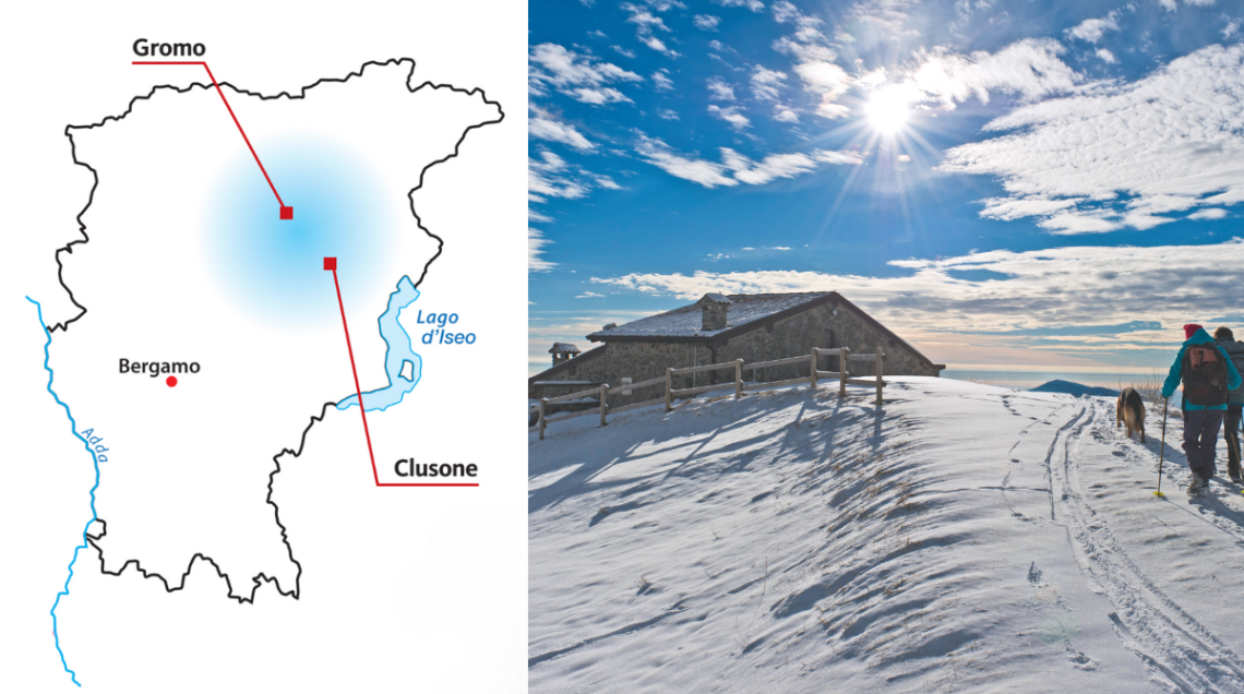 A destra, la Conca del Farno, un percorso di sci di fondo in Val Gandino. Credit: Cuboimages Agli amanti dell’aria aperta, la Val Gandino offre innumerevoli possibilità di itinerari e attività adatti alle più svariate esigenze: si va dalla semplice passeggiata per famiglie, alle tracce utilizzate per trekking e mountain bike, fino al parapendio. Nel periodo invernale ci si può divertire con lo sci da fondo, lungo un percorso attrezzato nella Conca del Farno (lecinqueterredellavalgandino.it). Diversi sentieri in mezzo alla natura partono dall’abitato di Parre, anche se qui il grande protagonista si trova a tavola. Sono gli scarpinocc, la pasta dal ripieno di magro (pane, formaggio, prezzemolo, aglio e spezie) che nella forma ricorda le pantofole un tempo cucite nelle case. Anche il condimento è di magro: burro e formaggio grattugiato in abbondanza. Altri 10 minuti d’auto verso nord e si arriva a Clusone, famosa per la Spessa, pista di fondo che ha ospitato la Coppa del Mondo nel 2000 e nel 2002. La si deve visitare anche per i suoi dipinti a cielo aperto: partendo dall’impressionante Danza della Morte sulla facciata dell’Oratorio dei Disciplini, si passa agli stemmi dei podestà sulla facciata del Palazzo comunale. Anche la loggia è affrescata con il suo orologio astronomico ancora in funzione dopo quattro secoli. Ultima tappa, la quattrocentesca chiesetta intitolata al martire egiziano San Defendente e a San Rocco, protettore delle pestilenze: porticata, custodisce 52 affreschi votivi che vanno dal Quattro al Seicento.