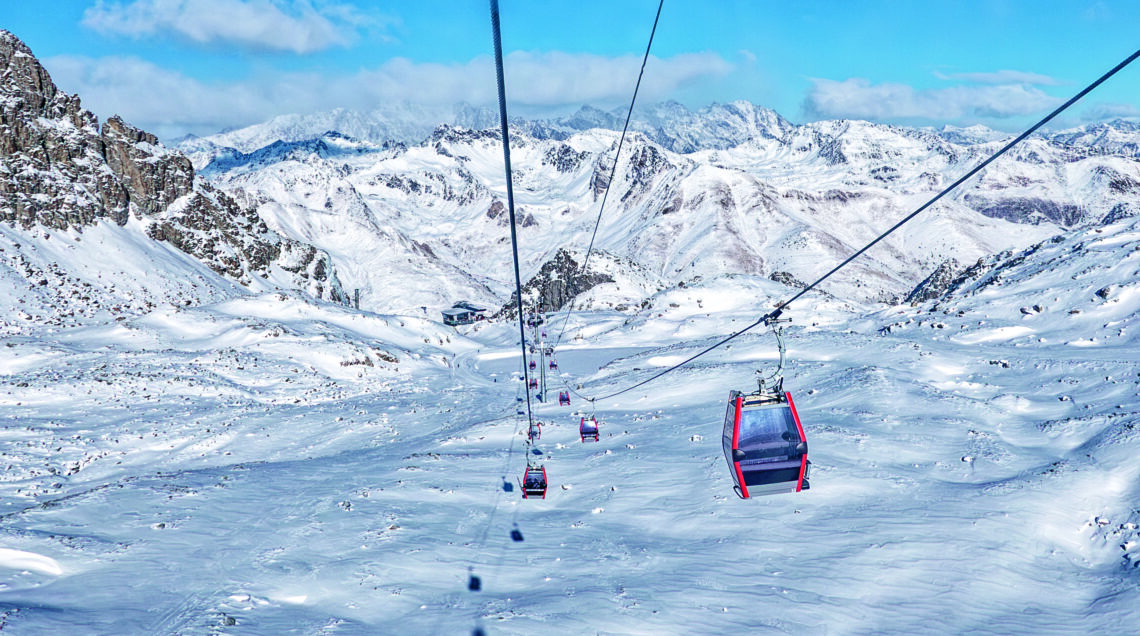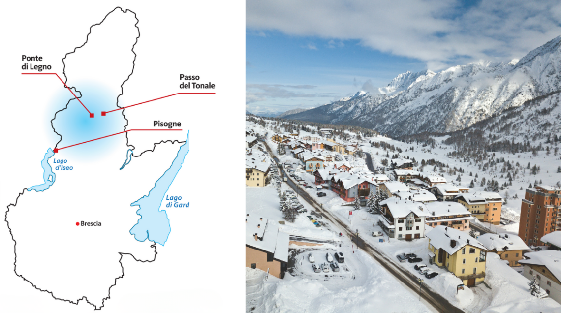 A destra, il Passo del Tonale, collegato a Ponte di Legno e punto di partenza per raggiungere il ghiacciaio Presena. Credit: Adobe Stock