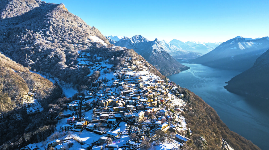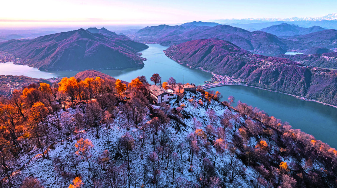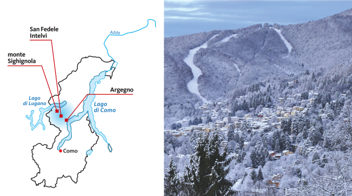 Dalle mura medievali che abbracciano il centro storico di Como, lasciandosi alle spalle alcune delle ville più ambìte dal jet set internazionale, serve mezz’ora di automobile lungo la costa occidentale del Lario per raggiungere Argegno. La strada, che è tutta a curve, vale una deviazione: porta in Val d’Intelvi, paradiso prealpino affacciato su due laghi, quello di Como e quello di Lugano. In un punto preciso, a 1320 metri di altezza, c’è il luogo ideale per ammirare il panorama a picco su Campione d’Italia: è il monte Sighignola, sulle cui pendici è attivo durante il periodo invernale l’unico impianto sciistico della provincia, frequentato principalmente da bambini e da adulti desiderosi di imparare a sciare. Durante la primavera e l’estate per raggiungerlo c’è chi inforca la mountain bike, affrontando un percorso che passa su strade asfaltate e sterrate: durante la pedalata, in località Caslè, si possono vedere alcuni giganteschi massi sui quali, in epoca preistorica, si celebravano riti propiziatori.