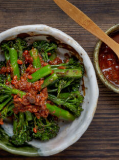 Portate una pentola di acqua salata a ebollizione e sbollentatevi i broccoli per 2 minuti o fino a quando gli steli saranno teneri, tuffateli in acqua ghiacciata e asciugateli su un telo da cucina. Spennellate i broccoli con un po' d'olio e condite con pepe nero, grigliateli fino a quando si saranno lievamente scuriti in superficie e ammorbiditi all'interno. Servite i broccoli caldi con la salsa preparata, un po' di zenzero in salamoia e la Mitsuba.