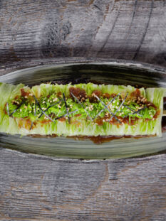 per il condimento: 30 g di scalogno tritato finemente - 1 spicchio d'aglio tritato - 20 g di zenzero grattuggiato - 100 ml salsa di soia - 100 ml di aceto di vino di riso - 200 g di miso Moromi (disponibile on-line e anche in negozi asiatici)