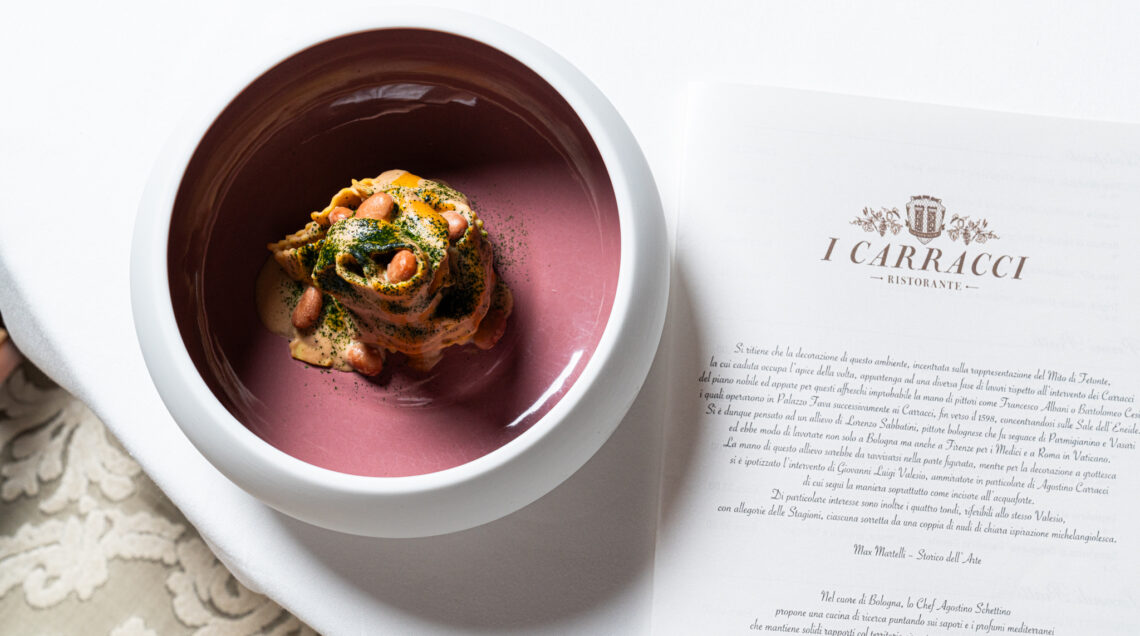 Dall’arte della cucina a quella della pittura e ritorno. È il percorso che propone il ristorante I Carracci, guidato dallo chef Agostino Schettini che si è ispirato al celebre quadro ”ll Mangiafagioli” del pittore bolognese Agostino Carracci per creare il suo signature dish: la Tagliatella fagioli, cozze e plancton marino (foto sopra).
