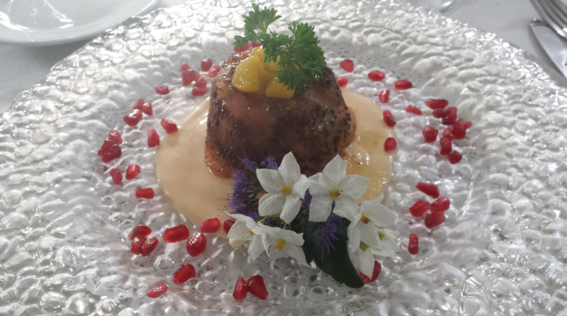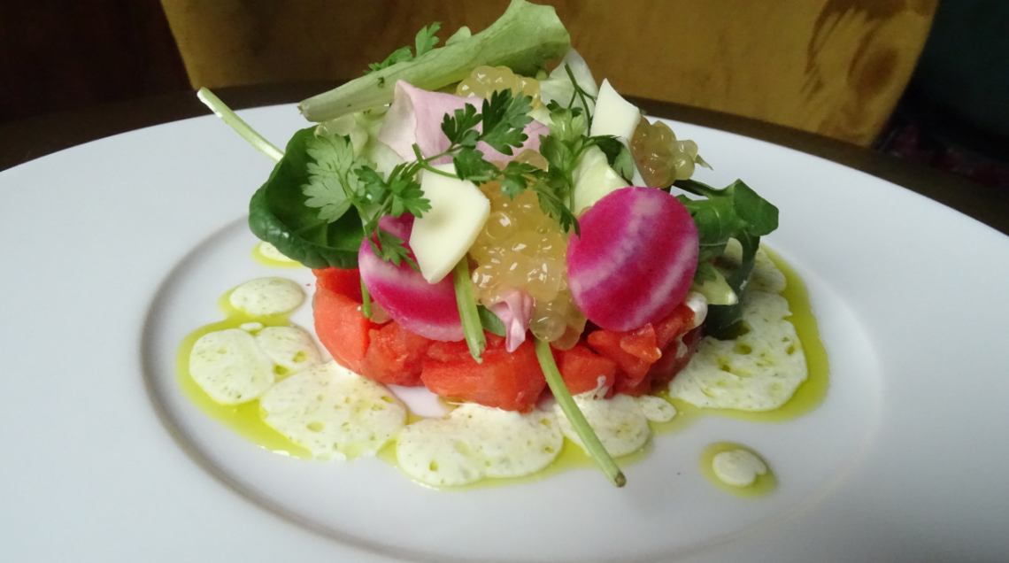 Salmone rosso selvaggio leggermente marinato e affumicato al coltello con cioccolato bianco (chef Francesco Germani)