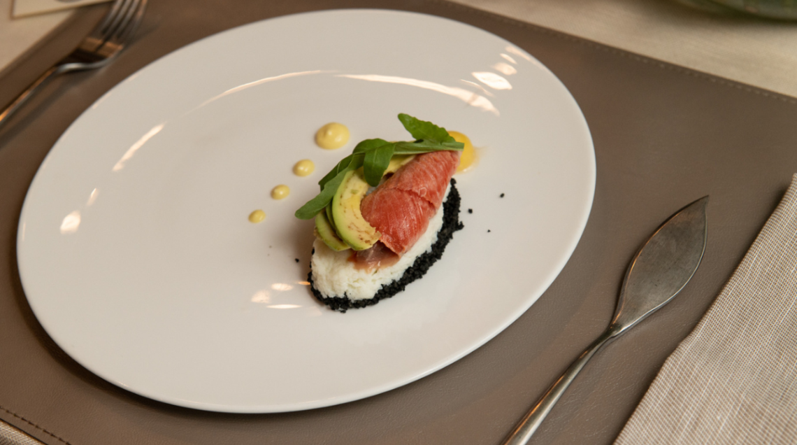 600 g di salmone, 20 g di uova di salmone, 60 g di maiones, 10 g di rafano grattugiato, 1 avocado, 1 uovo di gallina sodo, 4 uova di quaglia, 50 g di cous cous, 1 cucchiaio di nero di seppia, brodo di pesce, olio extravergine d'oliva, 1 rametto di ficoide, sale
