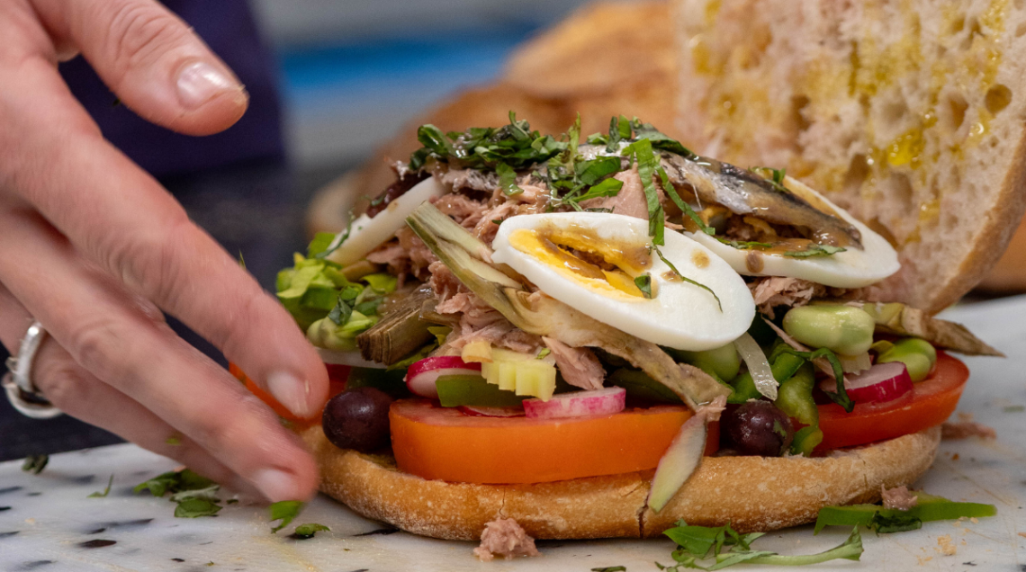 Il Pan Bagnat, piatto simbolo della cucina popolare nizzarda, deve il suo nome — letteralmente pane bagnato — alla sua umile origine. Inizialmente, infatti, era un modo ingegnoso per recuperare il pane raffermo: le massaie di Nizza bagnavano pagnotte e baguette sotto un getto d'acqua per ammorbidirle, usandole poi come base per un semplice accompagnamento o, più spesso, come letto per una ricca Salade (Niçoise, ça va sans dire) preparata in una terrina. Questa insalata iconica — un tripudio di prodotti locali e stagionali come pomodoro, cipollotti freschi, piccoli peperoni verdi, févettes (fave fresche), olive nere, basilico, sale, pepe e filetti di acciughe (in alcune versioni anche tonno o uova sode) — era il vero cuore del pasto. Con il tempo, però, il Pan Bagnat si è evoluto. Quella che era la base, è diventata il contenitore: l'insalata è stata trasferita direttamente all'interno di una pagnotta svuotata e intrisa dell'olio del condimento. È proprio in questa trasformazione che il Pan Bagnat diventa, a tutti gli effetti, la versione "street food" della Salade Niçoise. Prendendo tutti gli ingredienti freschi dell'insalata borghese e racchiudendoli in un panino pratico, unto e facilmente trasportabile, il Pan Bagnat ha democratizzato il piatto, portando il sapore di Nizza dalle tavole ai mercati e alle spiagge.