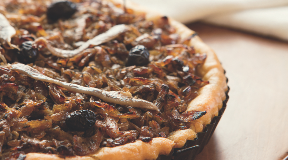 La Pissaladière è una delle regine della cucina provenzale. Non è una pizza (come potrebbe far pensare il suo nome), ma una focaccia alta e soffice che celebra la semplicità dei sapori del Mediterraneo. Tradizionalmente guarnita con un ricco strato di cipolle stufate, filetti di acciughe, olive nere (spesso le piccole, saporite olive di Nizza) è sapientemente aromatizzata con le classiche erbe di Provenza come timo e origano. La storia della Pissaladière è strettamente legata al mare e ai marinai di Nizza che, già nel XIV secolo, cercavano un modo per conservare il cibo durante le lunghe navigazioni. La soluzione fu il pissalat, un condimento a base di cipolle, acciughe e olio d'oliva che divenne la base di questa focaccia. Oggi è uno degli street food più amati della Costa Azzurra, spesso servita come antipasto o piatto unico. Ne esiste una variante molto diffusa anche in Liguria, in particolare nella zona di Imperia, conosciuta come piscialandrea o pissalandrea, che, però, prevede tra gli ingredienti anche il pomodoro.
