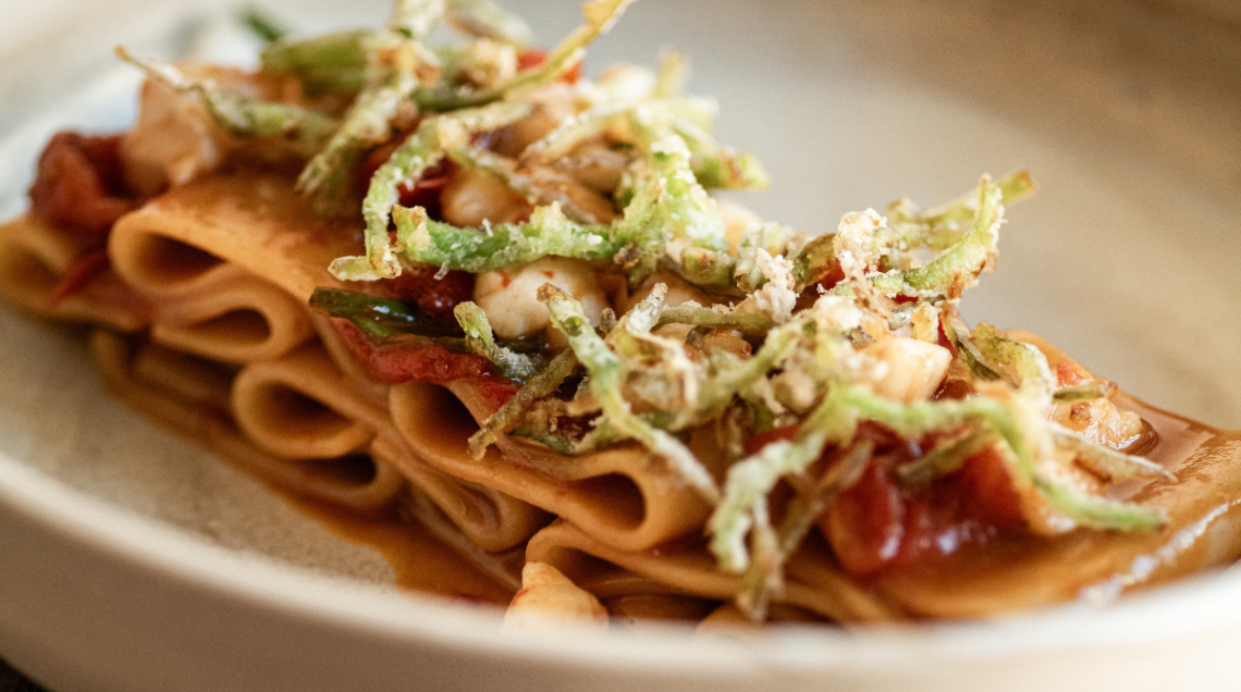 Con il suo comprovato estro, lo chef porta in tavola il profumo salino del mare e la dolcezza del lago. Dalla Campania, che onora con il “Pacchero con coccio e peperoncino verde” (foto sopra) e con la “Devozione, pasta al pomodoro corbarino”, arriva fino in Galizia con il “Polpo alla griglia con emulsione alla gallega e clorofilla di prezzemolo”. Poi torna a casa e dedica al Lago di Garda la “Trota, panna acida, frutto della passione e clorofilla d’aneto”. Un vero viaggio insomma. Che non disdegna una dedica anche ai grandi classici lontani dall'acqua, come la cotoletta alla milanese fatta però con il pesce spada. Da notare il risotto, cotto in estrazione di basilico, abbracciato dalla crema di Parmigiano Reggiano 30 mesi e musicato dal pesto di mandorle trapanesi, dove gli ingredienti di un solo piatto portano in giro per tutto lo Stivale. A fine pasto non mancano i dessert ormai iconici dello chef, come il “Tiramigiù” o la “Cheesecake al lampone”, a cui si aggiunge la carta dei gelati, tutti rigorosamente preparati in casa utilizzando anche frutta prodotta in proprio.