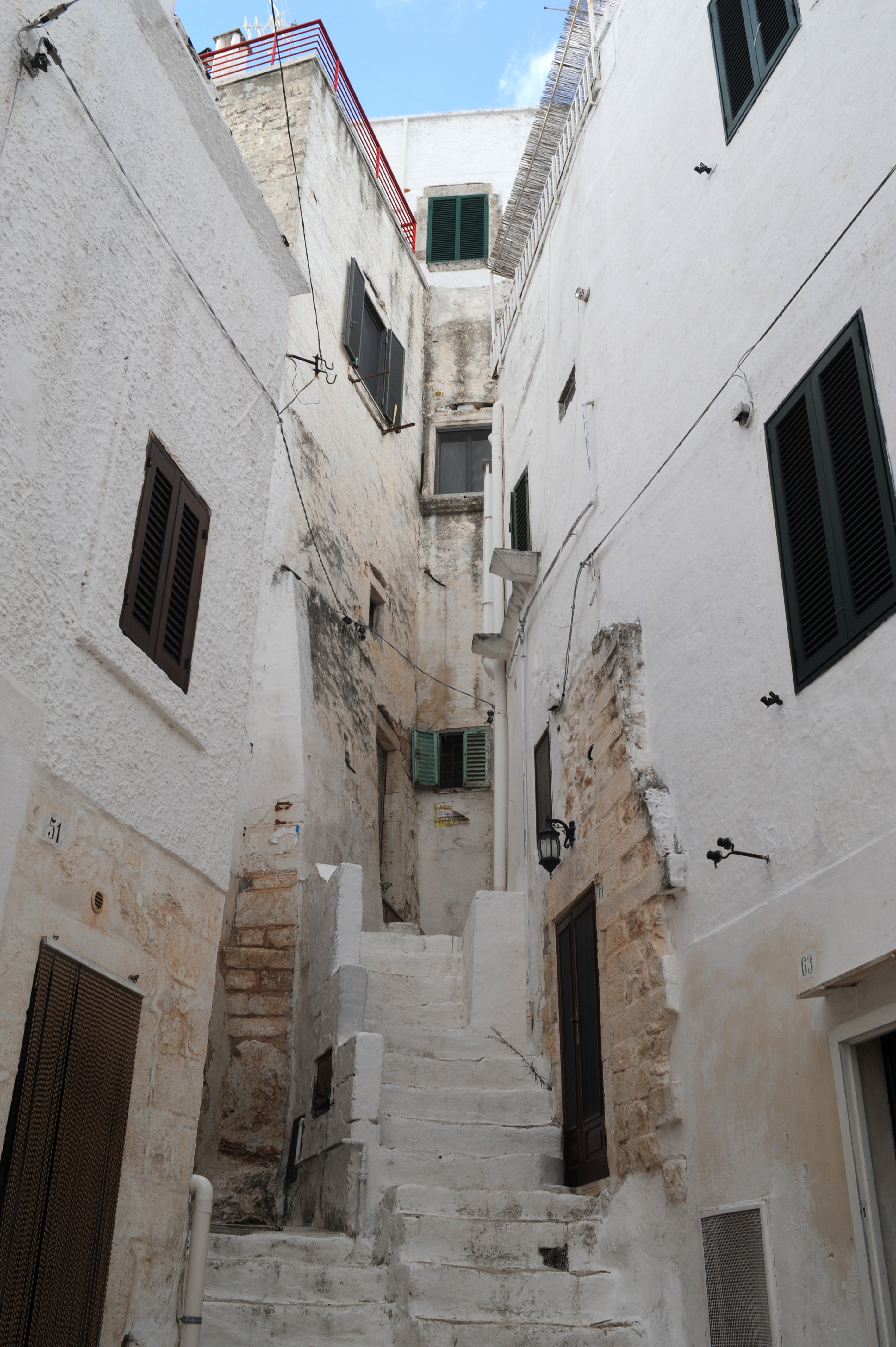 Il selciato allora si copre di liscissime e lucide chianche, le lastre di pietra calcarea pugliese che, con spessore ridotto, pavimentano anche gli interni dei trulli, mentre il candore della calce sui muri si fa abbacinante. Unico conforto per gli occhi, il reticolo di strette viuzze riparate dal sole che termina solo a ridosso della valle, dando spazio a vedute sconfinate sui campi. Così accade a Ostuni, la "bianca tra le bianche". Edificata su tre colli a partire dal VII secolo, ogni sua finestra si apre a una diversa altezza offrendo uno scorcio originale, finchè, raggiunta la Concattedrale, gotica e dal magnifico rosone, un arco inquadra l'azzurro del mare.