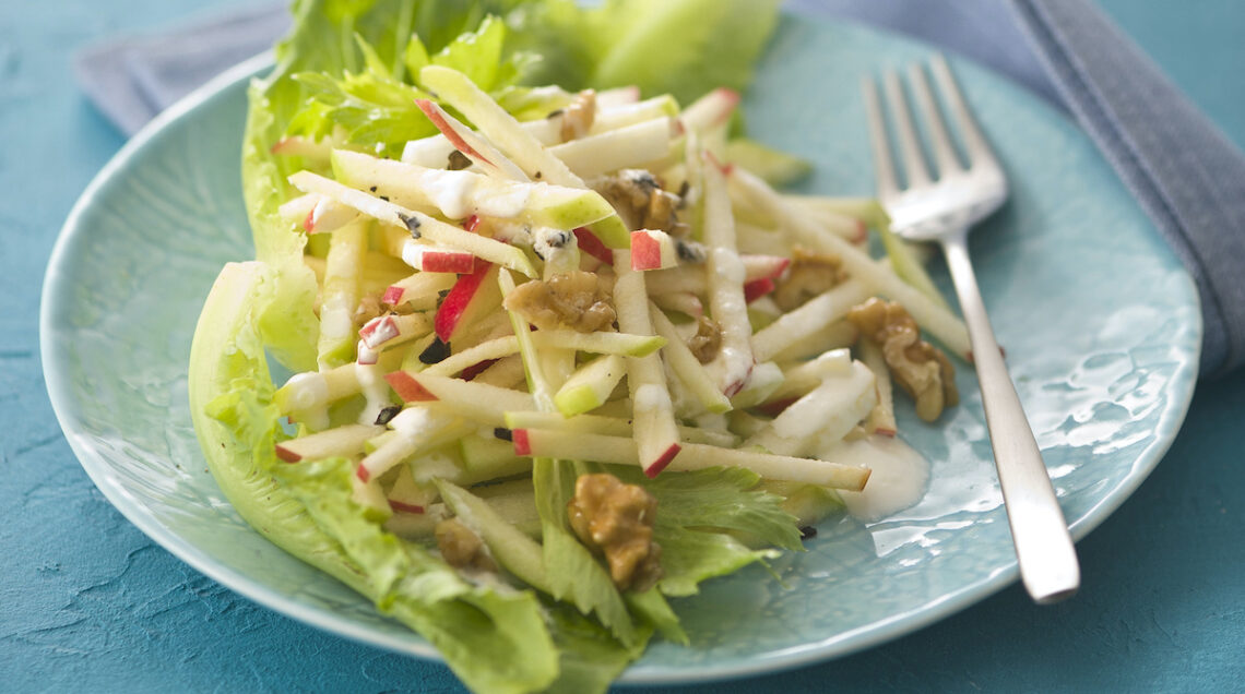 Parti uguali di sedano rapa e mela, con la sola aggiunta di maionese: questa è la ricetta originale dell’insalata ideata da Oscar Tschirky, maître presso l’Hôtel Waldorf di New York, intorno al 1893. Si racconta che Tschirky preparò questo semplicissimo piatto come delicato intermezzo fra le numerose portate di un ricco pranzo privato, organizzato dalla moglie di un famoso magnate del tempo a favore di un orfanotrofio. Questa essenziale ma raffinata insalata riscosse un enorme successo, tanto da entrare nel menu dell’albergo e divenne subito il piatto più richiesto, soprattutto nei pranzi di lavoro.