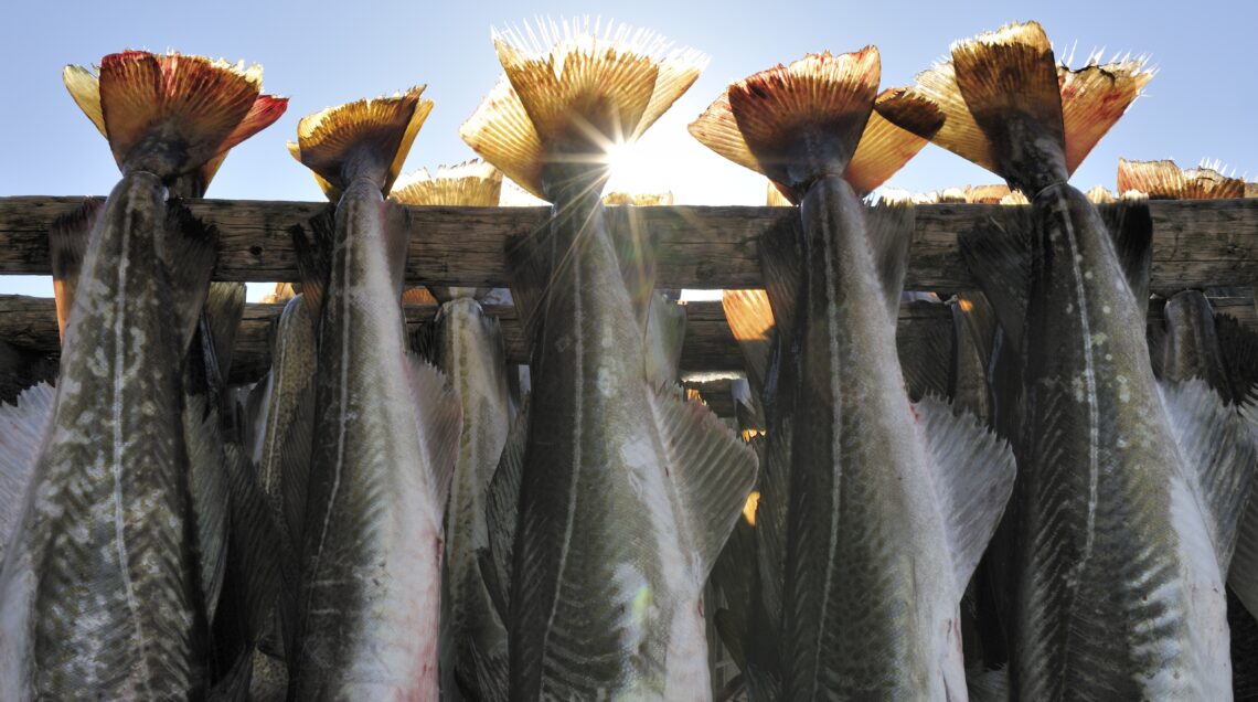 Prodotto top dell’esportazione norvegese, lo stoccafisso è merluzzo bianco atlantico, privato della testa e poi essiccato naturalmente, appeso per la coda perché rimanga esposto al sole e alla gelida aria artica; nella produzione industriale, appositi tunnel ventilati riproducono lo stesso clima. Originario del freddo Nord, lo stoccafisso ha percorso le vie commerciali verso sud e conquistato l’area mediterranea, grazie a un felice abbinamento con i suoi prodotti tipici. Olio, pomodoro, cipolla, aromi hanno dato vita a specialità gustose come il baccalà mantecato vicentino (dove lo stoccafisso viene chiamato baccalà); l’agghiotta di piscistoccu (pescestocco alla messinese) con sedano, olive verdi, pomodori, uvetta e pinoli, o il pesce stocco con la ghiotta calabrese (con cipolla di Tropea, olive, pomodori, capperi e patate) che si prepara sempre a Natale.