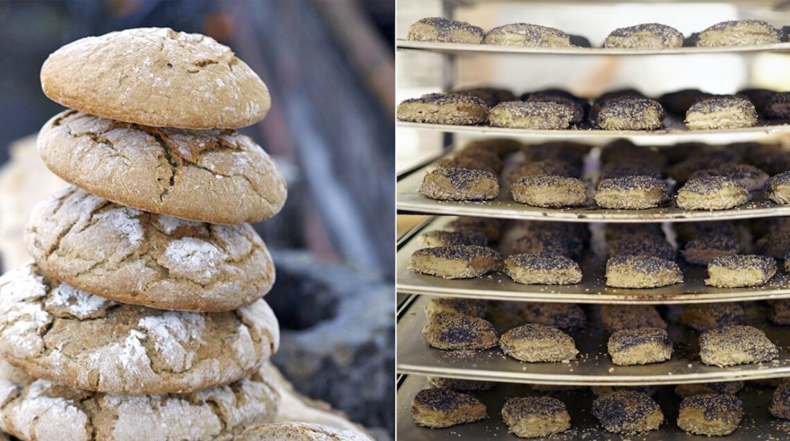 Qui sopra, le fasi di lavorazione del tipico Breatl, pagnotta piatta e rotonda a base di farina di segale, aromatizzata con una miscela di spezie (trigonella, finocchio, cumino, coriandolo, anice).