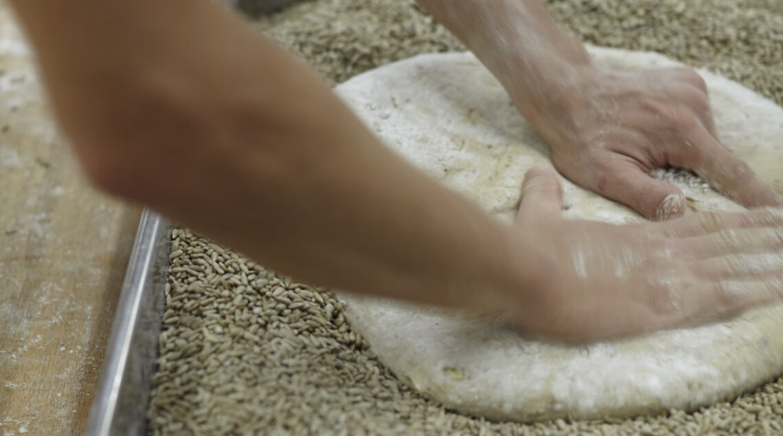 L’aggiunta di aceto di mele all’acqua tiepida serve a stabilizzare l’impasto. Dopo il riposo e la lievitazione naturale, quando sulla superficie si aprono gli “occhi”, le pagnotte sono pronte per il forno.