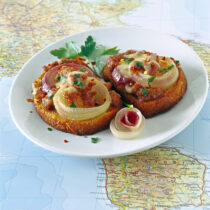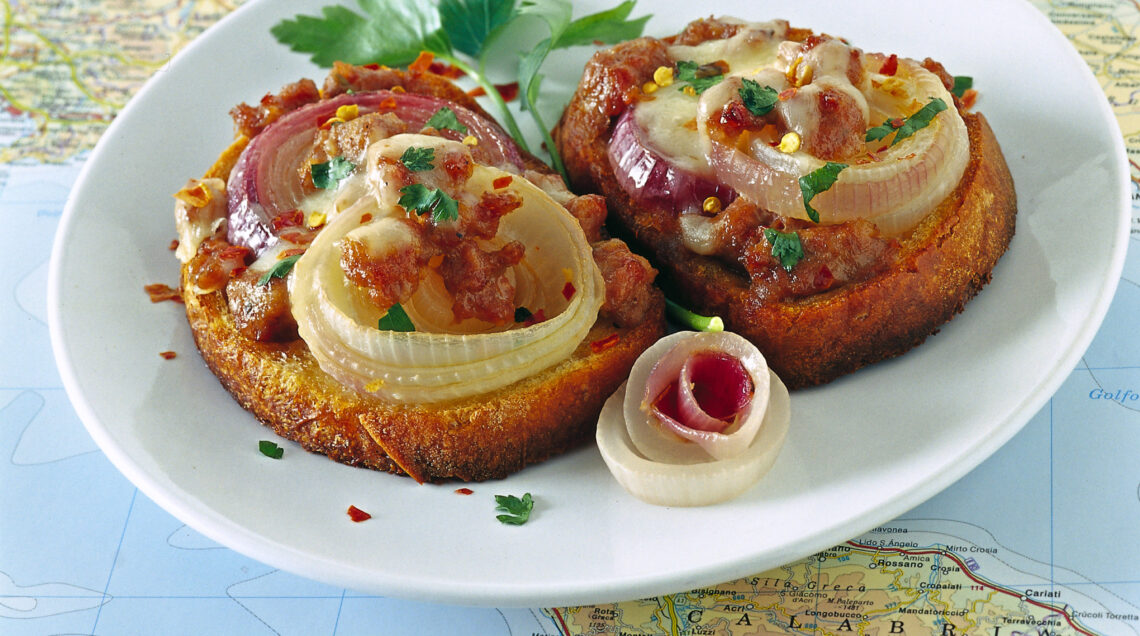 Ingrediente dalla forma particolare, tonda o allungata, che ricorda una trottola, la cipolla di Tropea ha un colore violaceo, una polpa dolce e succosa e si trova in circolazione dalla fine dell’estate e fino alla metà dell’autunno. Il sapore dolce e aromatico la rende perfetta per impreziosire primi piatti, secondi piatti o sfiziosi antipasti. Il gusto delicato le rende inoltre adatta sia cotta che cruda. Abbiamo raccolto in questa top ten dieci piatti diversi dove a fare la differenza è proprio la cipolla di Tropea. Dai crostini alle pappardelle con canocchie, dal gratin alla tatin di peperoni, senza tralasciare le rosse di Tropea all’aceto o la pizza con i pomodorini e la burrata.