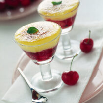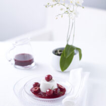 La gelatina di ciliegie accompagna la delicatezza della panna cotta, racchiusa da un fragrante guscio di frolla